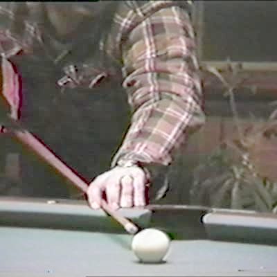 Orange cat sticks head out of billiards table pocket while man is trying to shoot