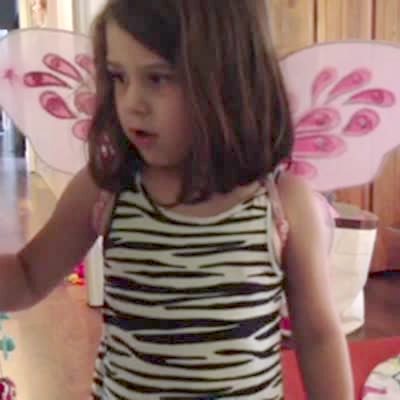 A girl wearing pink fairy wings bossily tells her father not to touch her toy microphone. She slips as she walks away and falls.