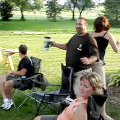 Man & woman dance butt to butt at picnic / party in the park, they fall over into a tree and land on top of each other.