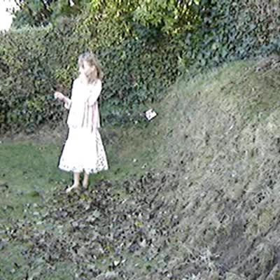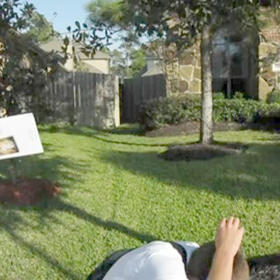 Female gardener giving demonstration about planting, goes to smell hole full of water and fertilizer. Husband pushes wife's head in the hole. She is covered in mud.