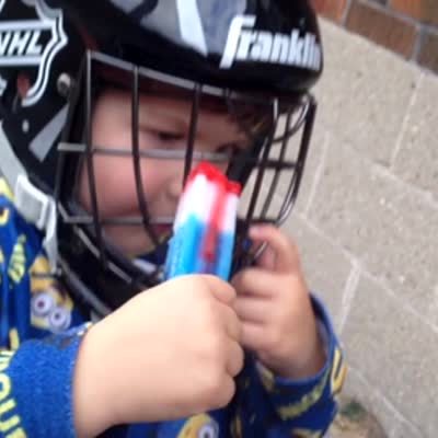 A tot boy tries to eat a Popsicle through a hockey mask.