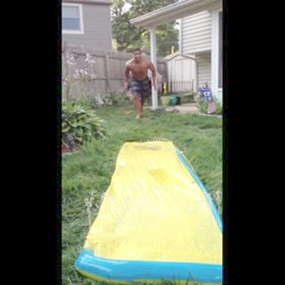 A man jumps on a slip n' slide outdoors and crashes into the camera.