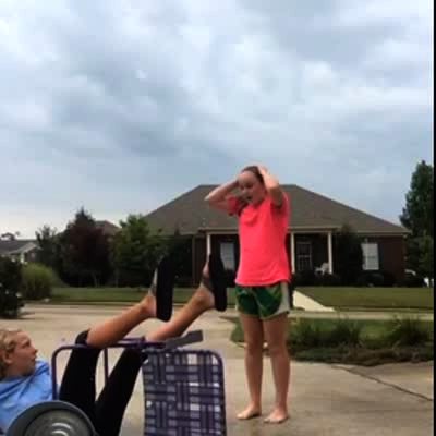 A young girl stands on a lawn chair and pours a bucket of ice water on her friend outdoors. The chair tips over and she falls on her butt. ALS Ice Bucket Challenge.