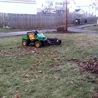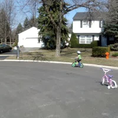 Young girl talks to her dad as her young brother rides around on a bike / bicycle. The young boy crashes into her and knocks her over, she falls down.