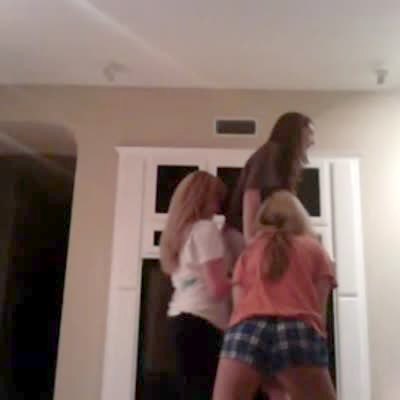 Four teen girls try to do a cheer lift at home, and drop the girl they are lifting.