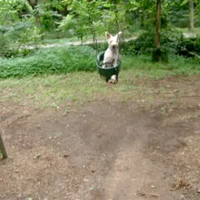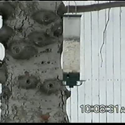 Gray squirrel tries to eat from a bird feeder hanging from a tree. He gets spun around and thrown off the tree. Spinning.
