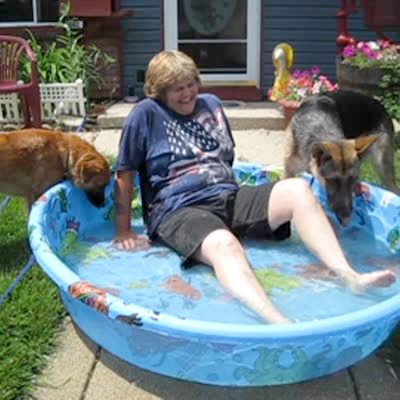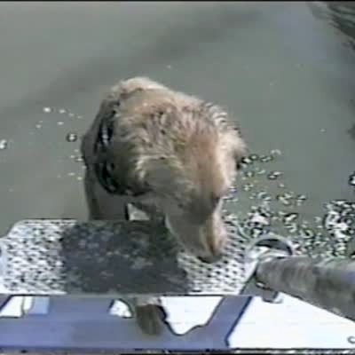 "Dockside Doggie" Dog slips off dock with ball in his mouth.
