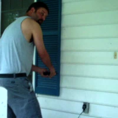 Man removes the shutter from outside the house to get a bat out, the bat flies right at man behind camera scaring him. He screams & curses. Scare.
