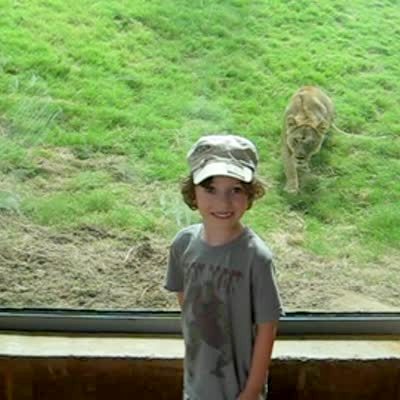 Boy stands in front of glass at zoo with his back to lion, she stalks and charges up to the glass swatting at the boy. When boy turns around he's scared by the lion & jumps back.