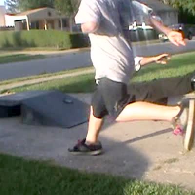 Man tries to balance on a skateboard on a ramp in the driveway, he falls hard. Dad, boneheads.