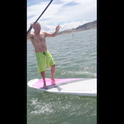 A man loses his balance and falls off of a paddle board outdoors in the water.