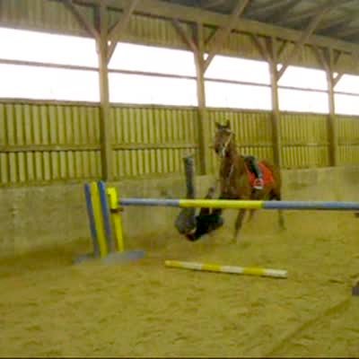 Teen girl tries to jump brown horse over hurdle in barn, horse stops short, girl tumbles/flips over front of horse into hurdle.