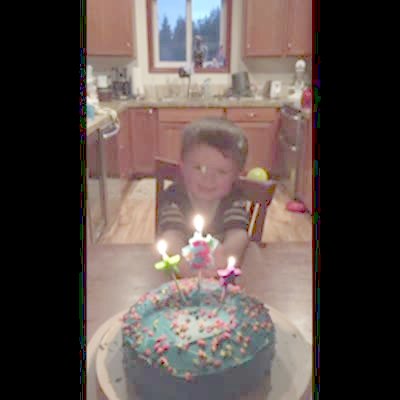 A tot boy struggles to blow out his birthday cake candles at the kitchen table.