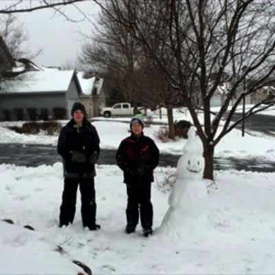 Two boys pose for a picture beside a snowman when one of them pushes the other one to fall against the snowman and knock it down. AA: Destroy a snowman.