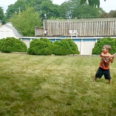 A young boy misses hitting a large water balloon with a bat. The balloon hits him and knocks the boy down in slow motion. AA: Super Slo-Mo Water Balloon