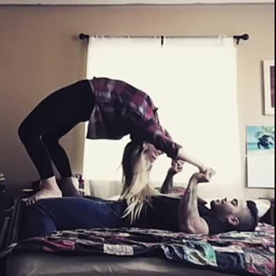 A man and woman do couples yoga on a bed and she falls in his lap.