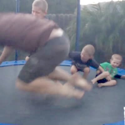A man and three boys jump on a trampoline in the yard outdoors and the trampoline rips and they fall through it onto the ground.