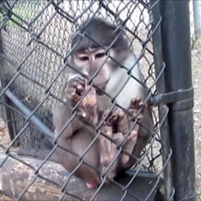 A boy says "hi monkey" to a monkey at zoo. Monkey looks up and then shows his butt to the boy.