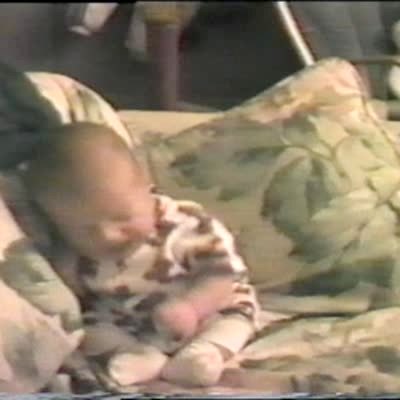 Baby boy sits in high chair with a cake in front of him at his 1st birthday party. Dad says that baby boy can't have his birthday present until October because it's a little brother or sister. Baby boy in high chair starts crying and his head falls into cake.