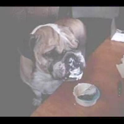 Bulldog eats ice cream out of a container while sitting at dining room table.