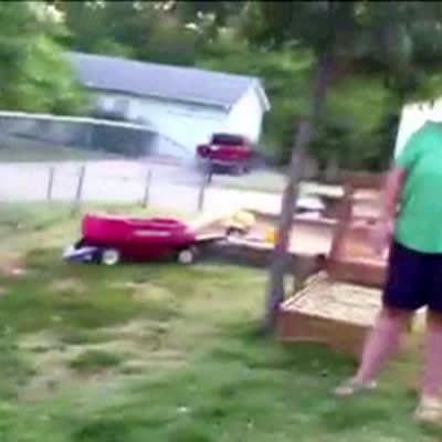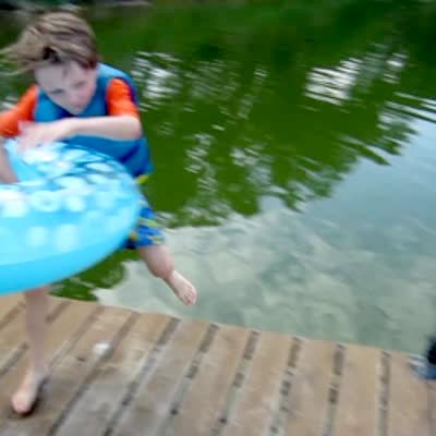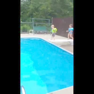 A young girl falls in a swimming pool when she misses pushing her tot brother in to the pool.