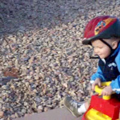 2 tots falls head first into toy car simultaneously, then a kid in a trailing car tips over