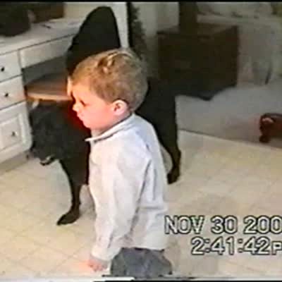 A tot boy calls "butt-hole!" repeatedly while trying to call his dog, Buster, indoors.