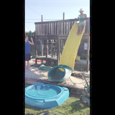 Young teen rides down a hill on a toy Tonka trunk and falls.