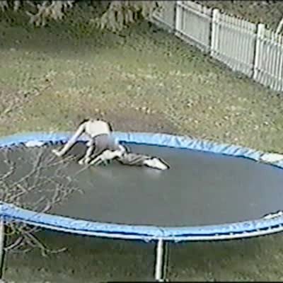 A boy jumps on a trampoline with a basketball between his legs and when he flips, the basketball goes into a hoop behind him.