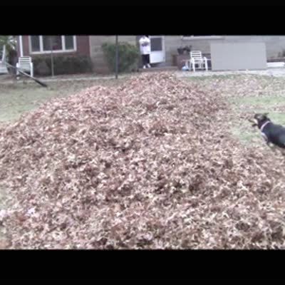 A dog plays in a pile of leaves outdoors and runs through it when he's let outside.