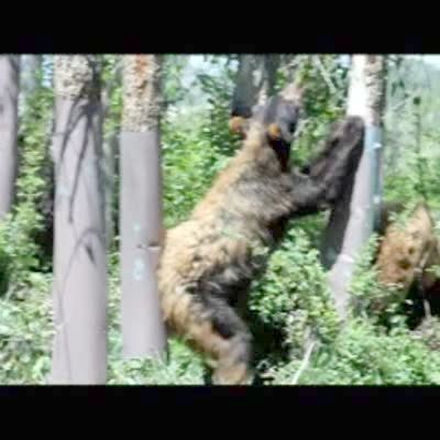 A bear rubs its butt against a tree in the woods while leaning on another tree.