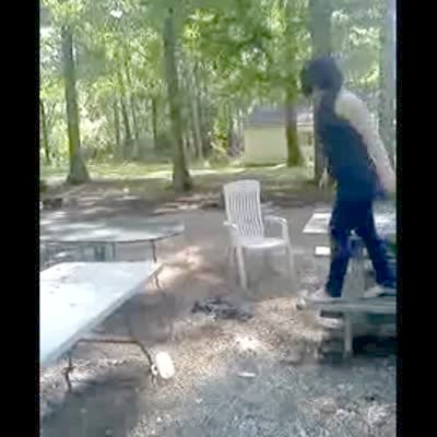 Teen jumping on park bench falls and almost breaks his leg. Brutal
