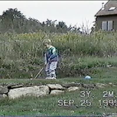 Boy swings on metal folding chair in swing in backyard, tries to flip out of swing, metal chair hits him in head, knocks him to ground.