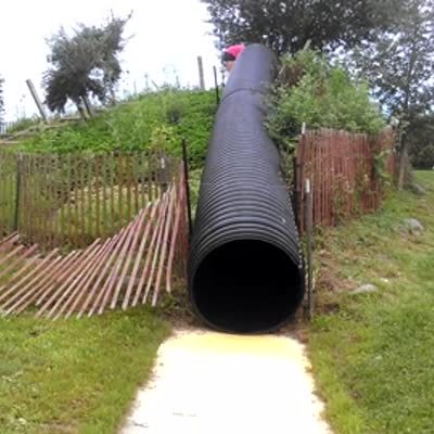 A boy makes a goat noise while going down a large plastic slide. Action at :02.