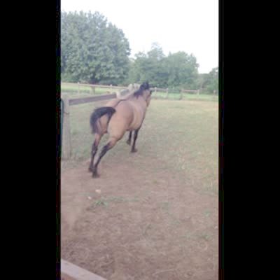 A horse runs alongside a girl outdoors and he lifts his leg toward her as he farts and continues running.