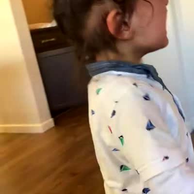 While standing on the top of a bunk bed in a bedroom, a young boy puts his foot into the hood of the sweatshirt he wears. The sweatshirt pulls him forward and he falls off the bed. TikTok video.