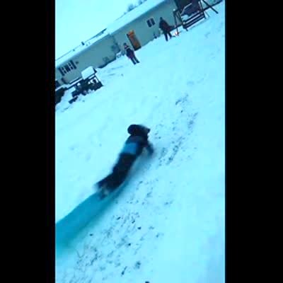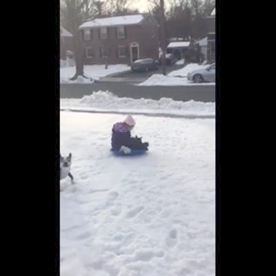 A dog runs beside a girl as she sleds down a small hill on snow. At the bottom, the dog takes the sled and runs back up the hill.