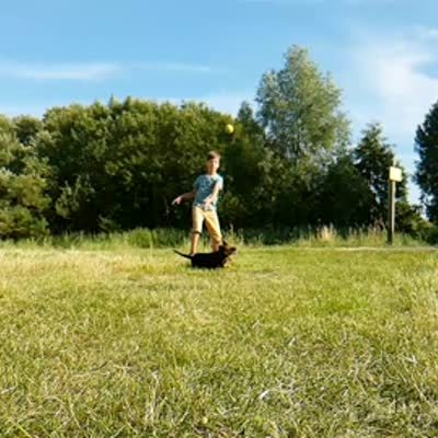 A young boy tosses a tennis ball and his dog tries to catch it but misses then runs straight into the camera in slo-mo