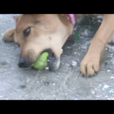 Dog finds a ball in the snow but it's frozen to the sidewalk and dog can't pull it off.