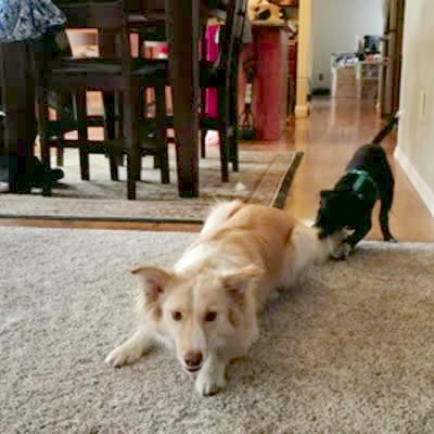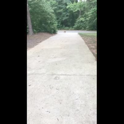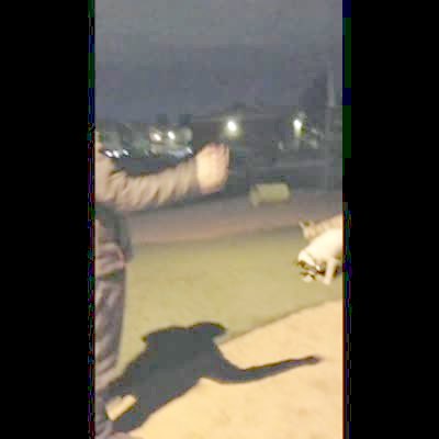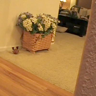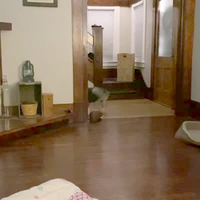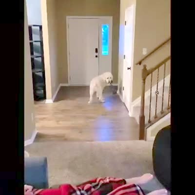 A dog walks backwards with a toy across the house entryway while the man behind the camera makes a "beep" noise.