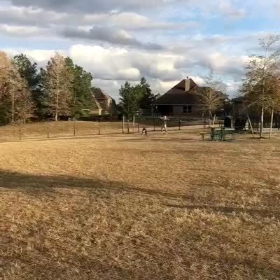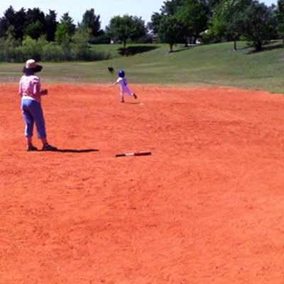 A Labrador dog knocks a young boy over on a baseball field to tag him out after she fetches a baseball he hits in to the outfield.