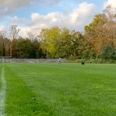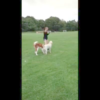 A teen girl holds a tree branch on a soccer field and throws it to play fetch with two dogs, but the branch spins around and hits her in the head as she throws it.
