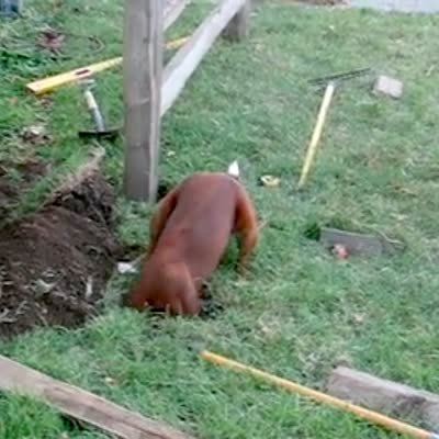 "Downward Facing Dog" Dog is retrieving a toy from a deep hole in the ground. His legs kick up in the air. He comes out with the toy.