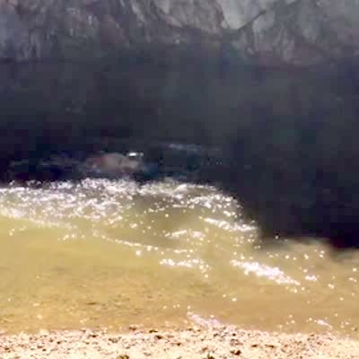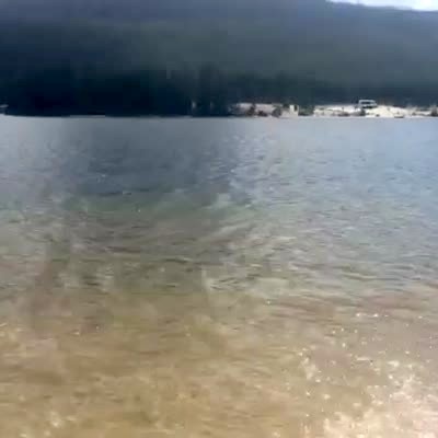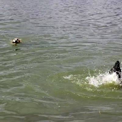 Two dogs swim in a lake, but one of them struggles more than the other and splashes frantically.