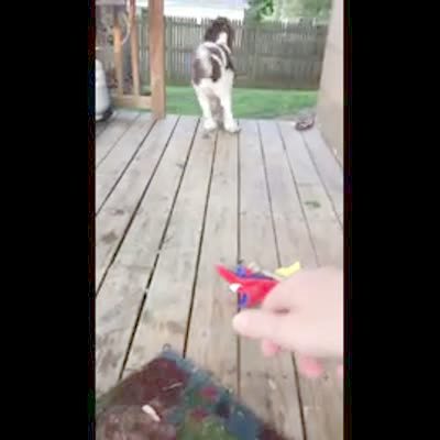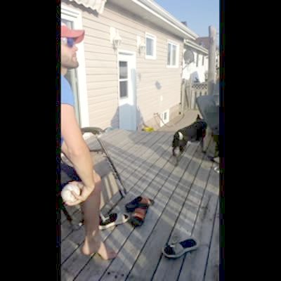 A man pretends to throw a softball and a dog runs off a porch to look for it. The man tries the trick a second time and the dog comes back to him with a different ball in its mouth.
