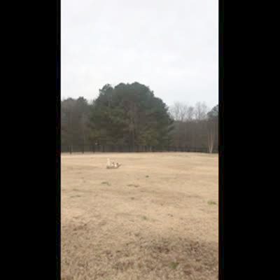 A dog falls in a field when a frisbee hits him in the back of the head before he can catch it.