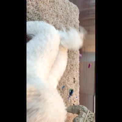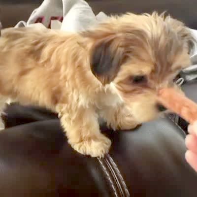 A puppy Morkie dog jumps off a living room couch into a box of packing peanuts to fetch a dog treat.