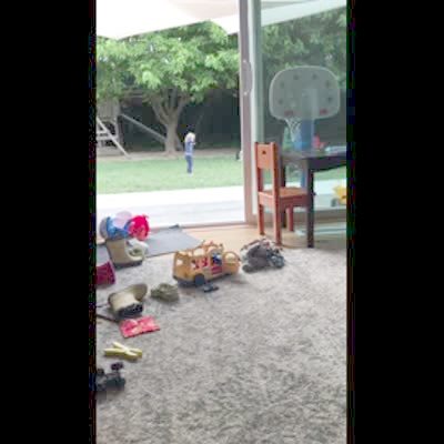 A man throws a tennis ball through a glass door for his dogs. His daughter runs through the yard and the ball hits the girl in the head.