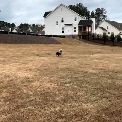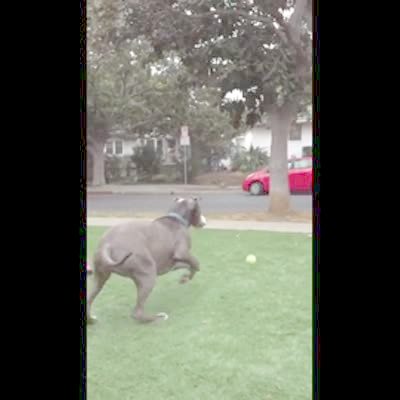 A dog plays fetch with a tennis ball and sprints back to a house and runs into a door when thunder booms.