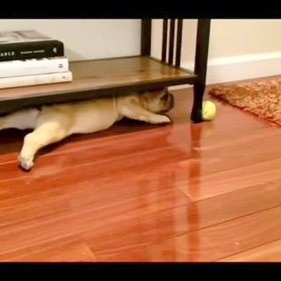 A French Bulldog puppy dog scoots under an end table in the living room to get his ball when he could have gone around.